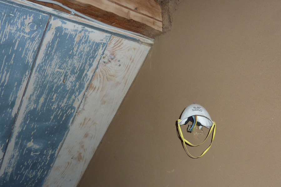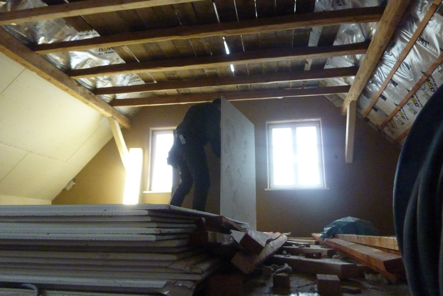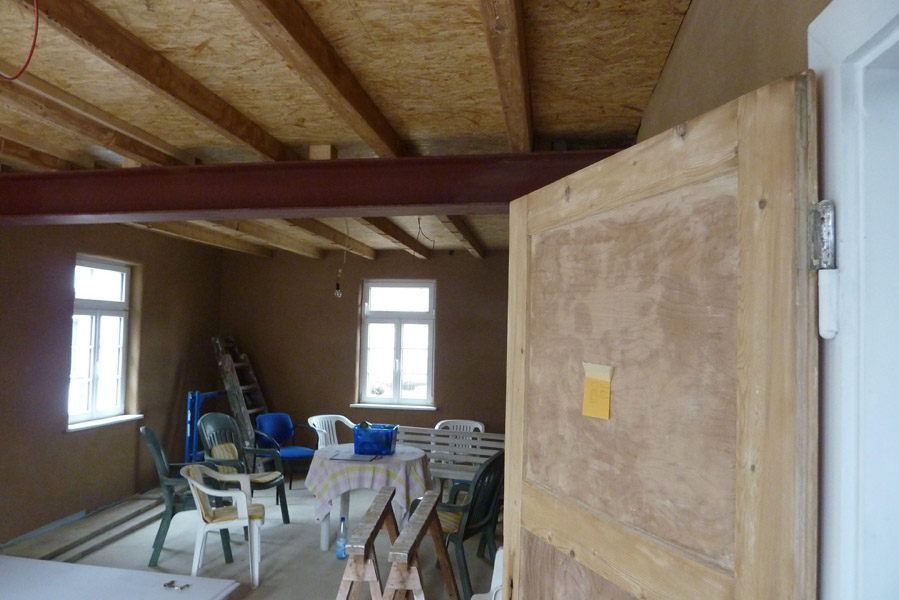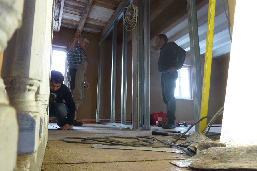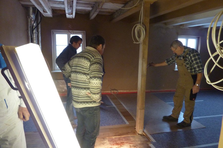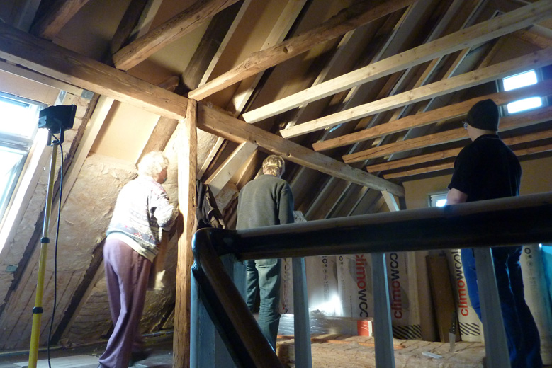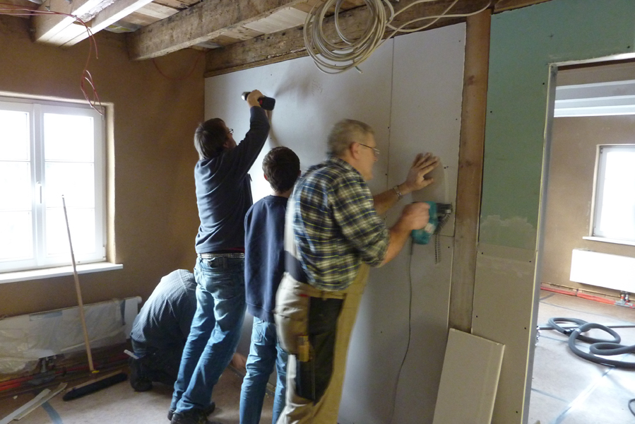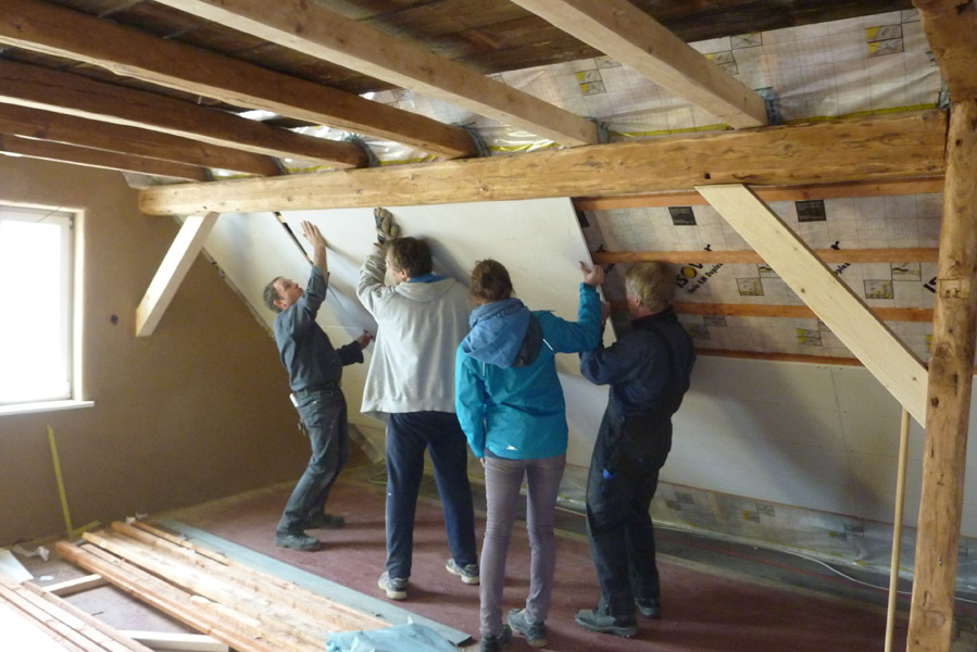 Tolle Tage!Ein ganzer Zug von Freiwilligen hat sich auf den Weg durch's Haus gemacht und Folien verklebt, frisch verlegte Böden abgedeckt, Treppengeländer abgeschliffen, Dachlatten verschraubt, Gipskarton angebracht, Wände eingezogen und Deckenbalken gestrichen. Und das ganz ohne Masken - denn die hingen an der Wand...