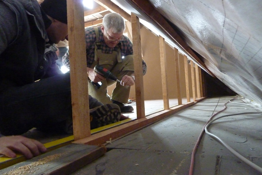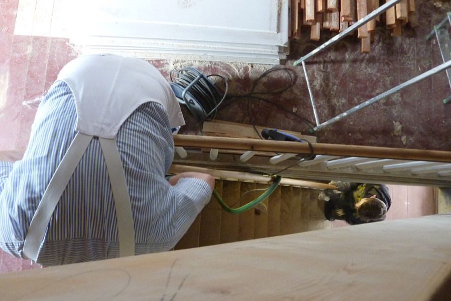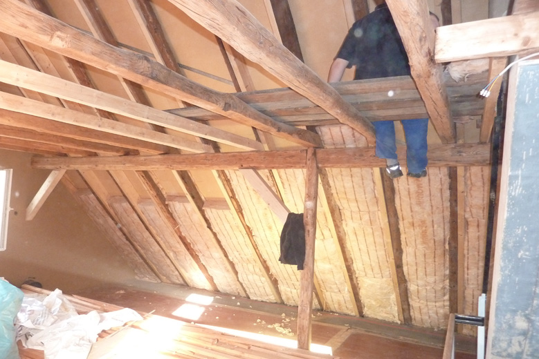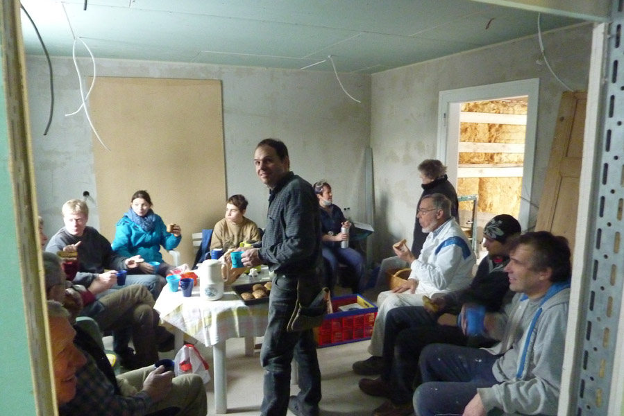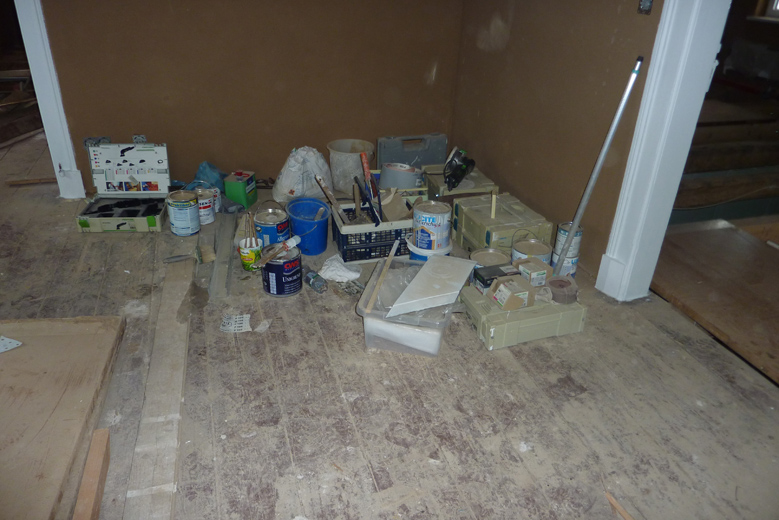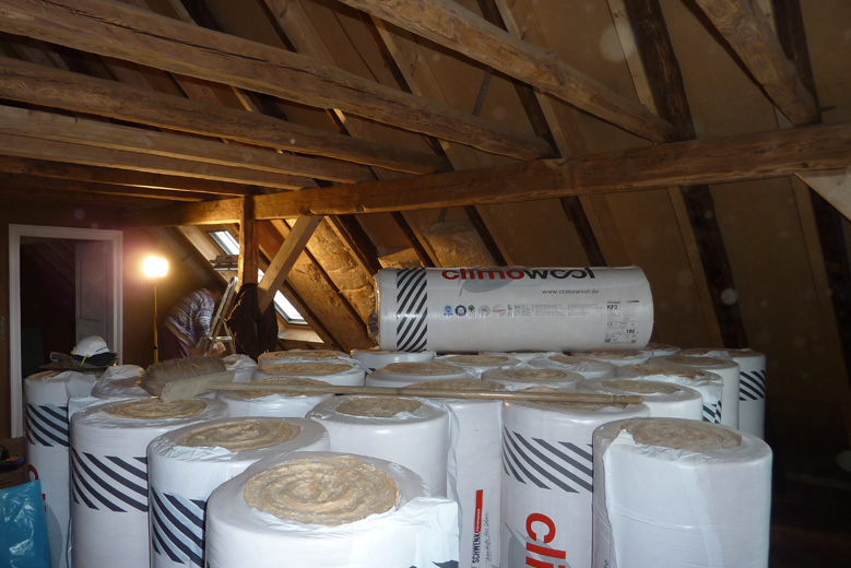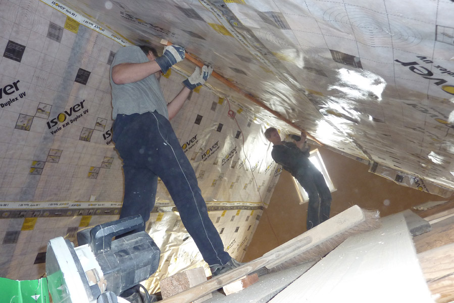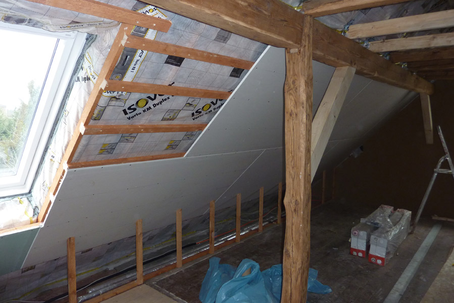 Tolle Tage!Ein ganzer Zug von Freiwilligen hat sich auf den Weg durch's Haus gemacht und Folien verklebt, frisch verlegte Böden abgedeckt, Treppengeländer abgeschliffen, Dachlatten verschraubt, Gipskarton angebracht, Wände eingezogen und Deckenbalken gestrichen. Und das ganz ohne Masken - denn die hingen an der Wand...