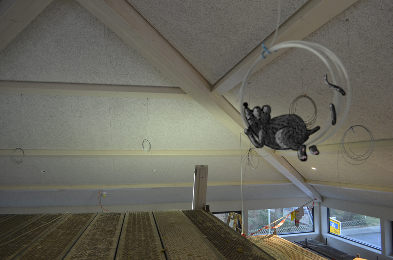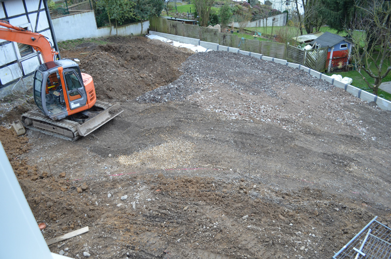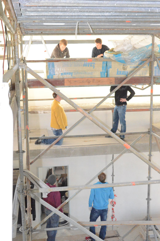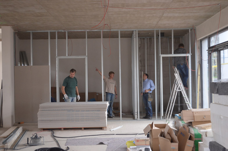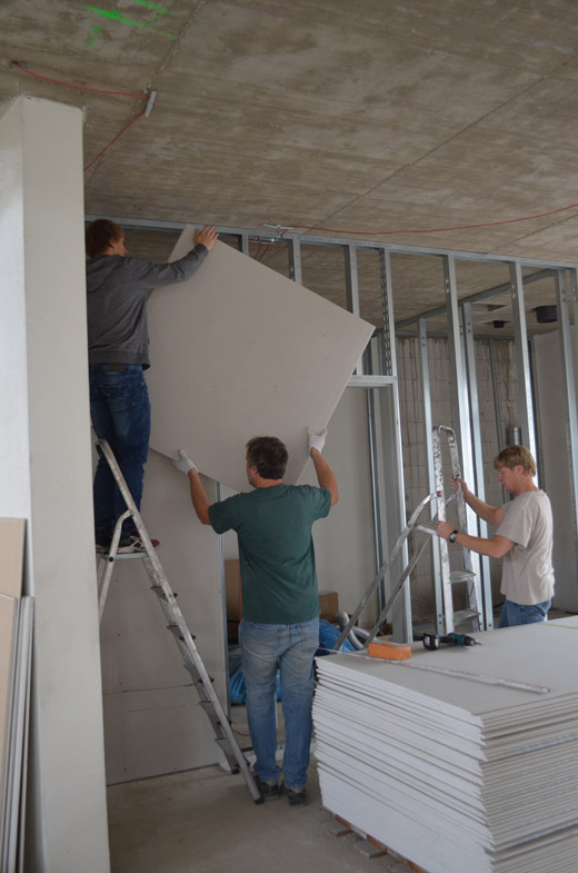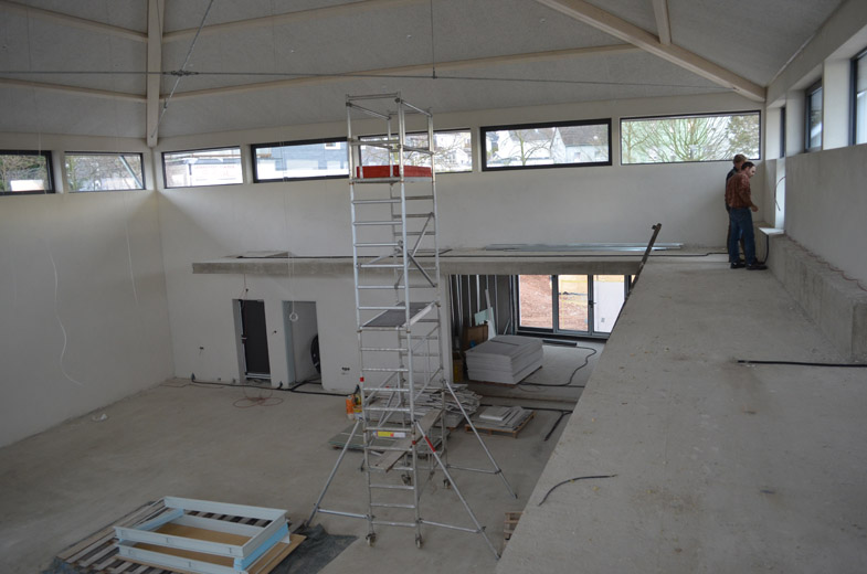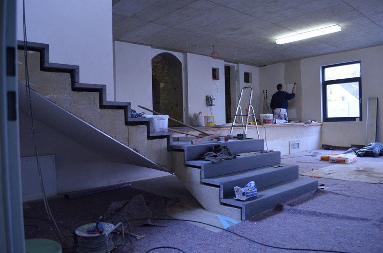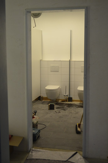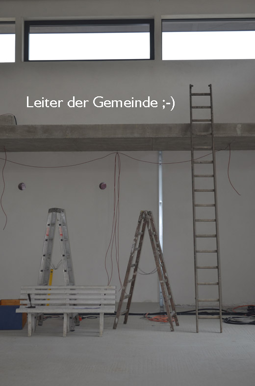 Es werde LichtDie Leuchten sind eingebaut. Bald folgt auch ein Lichtkranz (in der Aufhängung schaukelt zur Zeit noch Methusalem). Und auch das Außengelände nimmt langsam Formen an, damit am 1. März alles bereit ist.