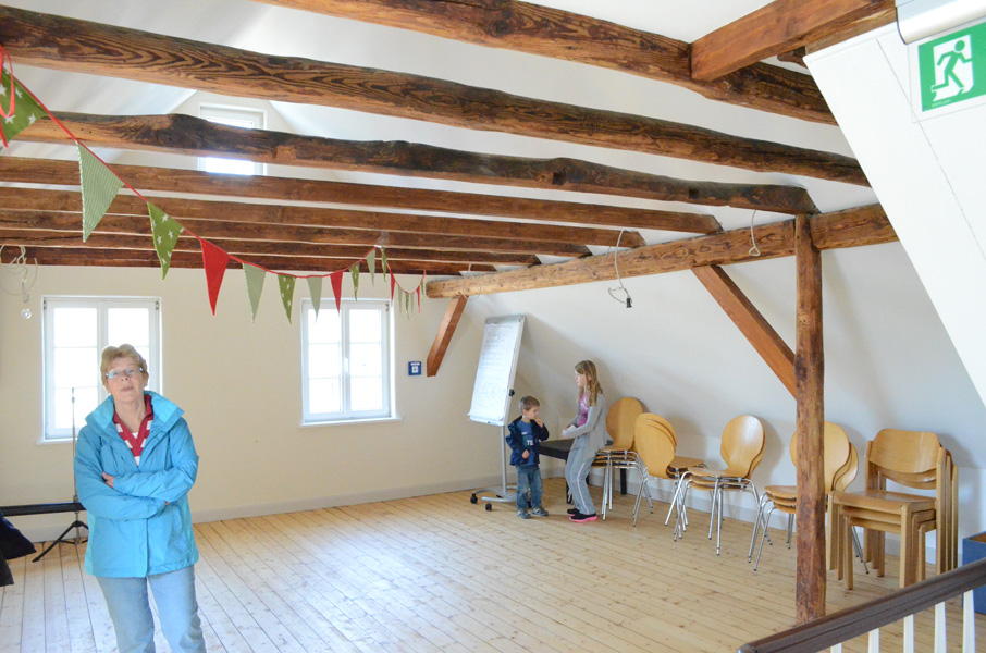 In dem Raum, der im nächsten Jahr in voller Schönheit funktionieren wird, waren aber trotzdem um 12.00 Uhr fast alle Plätze an den langen Tischen besetzt. Schon seit dem frühen Morgen wuselten fleißige Küchenhelferinnen durch den Rohbau. Hangelten sie sich an einem provisorischen Geländer hinunter in den Heizraum zur Kaffeemaschine?